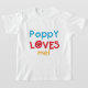 Poppy Loves Me T-shirts, cards, stickers, bodysuits bags, and more with colourful red, yellow, and blue text and heart design. These Poppy Loves me apparel and gift items will make poppy smile!