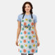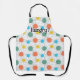 This apron has a mid-century modern design of circles with lines behind in orange, yellow, turquoise, and green.