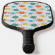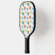 This pickleball paddle has a mid-century modern design of circles with lines behind in orange, yellow, turquoise, and green.