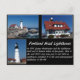This postcard has three different photos of the Portland Head Lighthouse. One is a closeup of the old keepers house with the top of the tower in view above it. The second is a shot taken from coast line looking towards the lighthouse complex. The third is a closed in shot of the tower. This is the most photographed lighthouse in Maine. The GPS co-ordinance's are printed on the back.