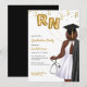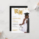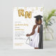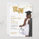 Portrait Nursing School Graduation Party Invitation. African American female Nurse Invitation for your daughter, niece, mother, aunt, cousin, or friend who is graduating from nursing school and is now officially a nurse. Women Nursing School Graduation Invitation for grad parties celebrating women who just graduated from nursing school. Celebrate the new Registered Nurse with this elegant nursing graduation invitation! Featuring portrait of a dark skin, plus size woman with wavy brown hair. The nurse grad is wearing a stylish white dress, a black graduation robe draped over her shoulder, and a matching black graduation cap. She holds gold foil style balloons with the letters RN in one hand and a stethoscope in the other hand. Accented with shimmering gold confetti, it perfectly captures the joy and excitement of her big achievement.