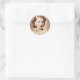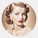 Round Sticker Portrait of a beautiful classic pinup 1950. A portrait of a beautiful classic pinup of the 1950s, with its light, fine and delicate complexion, its eyes made of a delicate khôl line, its fleshy lips underlined by a flamboyant red, its blond hair worked in loops, its earrings and its necklace made of pearls underline its cleavage. Visit my ZAZZLE shop! Menycrea_zazzle.fr