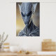 A portrait of a scary looking grey alien with blue eye. This is a AI generated art.