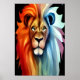 Portrait of a cute and adorable lion with warm colour on the one side and cold colour on the other side. This is a AI generated art.