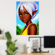 Portrait of a young women human elf hybrid with black skin, white hair and wearing a yellow dress. (Half human, Half elf). This is a AI generated art.