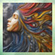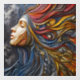 An abstract portrait capturing a woman's side view. Her face is slightly lifted, and her dense, long hair is depicted in a mesmerising dance of flying, weaving, and curling in an abstract style, on a shady grey granite. Vibrant colours and abstract lines come together in an artistic symphony, creating a truly magnificent piece of art.