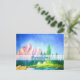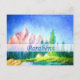This horizontal postcard has a painting with a big outdoors landscape, a pink rocky mountain, a pine forest river valley, and a semitransparent stripe with the Portuguese birthday expression: “Parabéns.” This postcard is an elegant mailing item to send to your friends and loved ones. You can also match it with stickers, cards, envelops, and stamps.