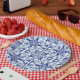 This product has an intricate design with a dark blue background and white ornamental patterns. The design is reminiscent of traditional ceramic or porcelain styles, which may interest those who appreciate classic or vintage aesthetics.