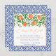 Watercolor oranges, pretty blossoms and dark green glossy leaves are complemented by a cobalt blue and white tile border and pattern reverse on these Change The Date cards.