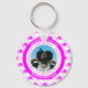 Chic, stylish, Christian I AM positive affirmation keychain, with CUSTOMIZABLE photo and Bible Scriptures. The design shows a circular photo in the middle with two outer circles of CUSTOMIZABLE text. The outer circle reads I AM WHO GOD SAYS I AM, plus placeholder name. The inner circle gives popular Christian verses relating to I AM LOVED, ABLE, PRECIOUS and BLESSED. Hot pink double hearts in a tiled pattern are set against a plain white background. Create your own personalised text on the outer and inner circles and add your name. This would make a great stocking stuffer, favour giveaway or gift of positive affirmations for yourself or a loved one. Choose from a wide selection of inspirational Christian gifts and home decor designed by #bereandesigns. Matching gifts available.