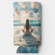 A coffee water can cooler with a positive affirmations quote. I am worthy of love. Ai art illustration of a woman meditating by the clear blue ocean waves, surrounded by sea glass, on a sandy beach, with beautiful clouds floating in the sky.