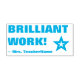 This motivating rubber stamp design features the positive feedback message "BRILLIANT WORK!" and a customised educator name. It also features a decorative star shape icon. It could be used by a school teacher or educator when grading student work, to acknowledge that a student has done an exceptional job.