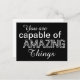 Send someone positive vibes to lift their spirts with the encouraging words You Are Capable of Amazing Things in artsy typography in white on a classic black background.