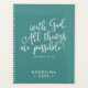 A modern typographical Christian planner featuring the Bible verse Matthew 19:26 With God all things are possible" in white whimsical script font, personalised with your name and year at the bottom. The background colour is in modern teal, which can be edited.