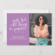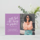 A modern Christian graduation announcement card, featuring the Bible verse Matthew 19:26 "With God all things are possible"  in white modern script font, on a lilac background that can be edited by clicking 'customise further', next to a photo of the graduate. Personalise with graduation details in white sans serif font.
