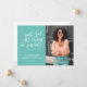 A modern Christian graduation announcement card, featuring the Bible verse Matthew 19:26 "With God all things are possible" in white modern script font, on a teal background that can be edited by clicking 'customise further', next to a photo of the graduate. Personalise with graduation details in white sans serif font.