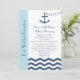 This post wedding reception invitation has a nautical theme and features the words "Post Wedding Reception" on the left on a light blue strip, but the focal point of the design is an anchor with a heart chain being tossed into a chevron or zigzag sea. You can customise the invite with the name of the bride and groom, the date and place of marriage and all your post wedding reception invitation details. Copyright henishouseofpaper