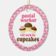 Postal Worker ornament has funny will work for cupcakes quote and a trio of cute chocolate cupcakes occupation design. It makes a great Christmas gift idea or retirement gift for a woman or female Postal Worker.