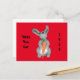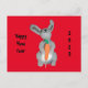 Rabbit wishing a Happy New Year for 2023 on a red background. Rabbit is a grey yarn doll, holding an orange carrot.
