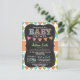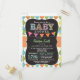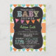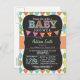 Neutral baby shower invitation with cute chalkboard look font on colourful orange, green, yellow, and teal blue argyle pattern. Vintage feel chalk fonts on cool blackboard background with colourful pink, orange, purple, and green bunting flags.