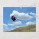 Hot air balloon -Black with coloured "brush strokes" - floating in a blue sky with white clouds over the hills.