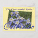 Blue symbolises the sky; white symbolises the snow; while yellow symbolises Colorado's gold mining history. This makes the Rocky Mountain Columbine or Colorado Blue Columbine the perfect choice for the Colorado State Flower, as it was so designated in 1899 following a vote of Colorado's school children. In 1915, the tune "Where The Columbine's Grow" was adopted as the official Colorado State Song. In April, 1999, a heinous and horrific shooting forever linked "Columbine" with tragedy, in this country. I hope exploring the symbolism of this beautiful bloom, provides a little separation. The ancient Greeks and Romans attributed this plant to the goddess of love, Aphrodite. The flower, with it's unusual spurs, is also thought to resemble the hat of a court jester, lending it to an association with "the fool". In the Victorian language of flowers, gifts of Columbines meant, "resolved to win". Interestingly, Columbines have been mentioned or depicted in the Christian religion over many centuries. Some Christians believed the the Columbine flower had the meaning of the Seven Gifts of the Holy Spirit. These included: wisdom, intellect, reverence or piety, strength, advise, knowledge and fear -- as in the fear of God or the fear of doing wrong in the eyes of God. The colour of the petals is also significant. Blues and purples mean "penance". The spurs of the Columbine flowers (those elongated petals that hang below the flower) have evolved to different lengths and widths to accommodate the pollinators indigenous to the area in which they grow. Those elongated spurs remind me of honeysuckle flowers, which also have spurs beneath the petals. The flowers ARE edible and sweet, while the seeds and roots are HIGHLY toxic. As it is difficult to determine which blooms house seeds, best to get sweets from safer and more reliable sources. Of course, this design is not just a tribute to the lovely, somewhat exotic, Columbine flower; it also pays homage to our 38th state. Colorado is nicknamed "The Centennial State" because it became a state in 1876, the 100th anniversary of the United States Declaration of Independence. Though Colorado has a diverse geography, the outline of the state is curiously square-like. That's because, like Wyoming and Utah, the borders of Colorado were originally defined along lines of latitude and longitude. This delightful design offers an outline of the state of Colorado, filled with their state flower, the truly astonishing and aptly named, "Colorado Blue Columbine". These delightful postcards can be purchased before your vacation so you lose no time searching for them and can concentrate on all the beauty around you. Pair with the matching postage stamps for even more impressive presentation.