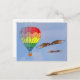 Hot Air Balloon and two birds fly in a blue sky with faint clouds. Balloon has rainbow stripes of red, orange, yellow, green, and blue. Birds have brown wings. Back of card has title "Come Fly With Me."