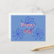 Fireworks offer a "Happy 4th!" greeting. Pinwheels of bright blue stars surround the text that shows in red and white with drop shadowing. Background is a medium blue.