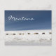 Postcard from Montana, featuring a row of wild horses crossing a snow covered hill in the winter under a cloudy blue sky.