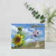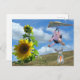 Animal friends at play. Rabbit with a carrot is watching a pink pig flying her hang glider over a sunflower Fluffy white clouds in blue sky over a grassy hill.