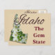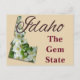 Big cities and their lights are not really an issue in Idaho so night brings a brighter and more beautiful starry sky than in most places. From skiing to fishing and white-water-rafting, Idaho is an excellent destination choice for those that love adventure in the out of doors. It's also a great place to go if you prefer quiet possibilities of finding gold or gems. There are numerous places in Idaho where you can pan for gold, garnet, opal, jade, topaz, tourmaline and many other gems and minerals. That would be, of course, why it's nickname is "The Gem State". As you may know, Idaho is the number one producer of potatoes in the nation. But Idaho contributes much more than just potatoes: milk, cattle, hay, wheat, sugarbeets, barley, dry beans, corn, onions, hops, lentils . . . they are in the top ten in production for nearly 30 of the commodities produced. Idaho even has three approved wine-grape growing regions. The state vegetable, as you might suspect, is the potato. The state horse is the Appaloosa and the state fish is the Cutthroat Trout. An amazing 63% of Idaho is public land which is particularly impressive as Idaho is the 13th largest state in the United States. This wonderful design pays homage to our amazing 43rd state. The outline of the state is filled with the state flower, the mock orange (blossom). A nod to their fertile soil, a deep rich brown for "Idaho" on a soft "russet" (potato pun intended) background with a "garnet" red "The Gem State". These delightful postcards can be purchased before your vacation so you lose no time searching for them and can concentrate on all the beauty around you. Pair with the matching postage stamps for even more impressive presentation.