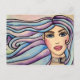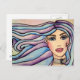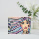 Lovely postcard with illustration watercolor portrait of a young girl with blue eyes, pink lips, delicate and feminine features, long hair in blue and violet tones.