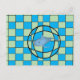 Green and blue chequerboard with optical illusion of a 3D ball in centre. Toy whale is positioned to seem to be floating through the skin of the ball.