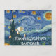 Wish your friends a Thanksgivukkah Sameach (Happy Thanksgivukkah) with this parody postcard. Riffing off of Van Gogh's painting Starry Night, this version has latkes, sour cream, menorah flames, and a little dreidel.