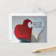 The postcard is a graphic design of 2 heart puzzle pieces. The red piece says, "Being someone's first love is great" the white piece says, "but to be their last is priceless."