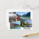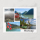 Postcard with 4 landscapes collage with water in Norway, a Norwegian flag, a boathouse, boats and a fjord.