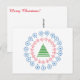 A stylised green tree sits in the centre of circle of small red ornaments, inside a circle of medium sized blue ornaments. "Merry Christmas!" text in red script on message side of card may be edited/removed.