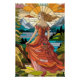 This vibrant stained glass artwork depicts a beautiful woman in an ornate, flowing dress, her long hair cascading gracefully as she stands on a rocky landscape. The woman appears to be gazing at a breathtaking view that includes majestic mountains, a serene lake, and a dramatic sky. The artwork is rich in detail, with bold, colourful panes creating a dynamic contrast between the figure and the natural scene. The stained glass effect enhances the beauty of the landscape and the elegance of the woman, making it perfect for a striking poster or wall art piece that radiates beauty and tranquillity.