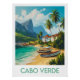 Experience the laid-back charm of Cape Verde with this sunny poster. Colorful boats rest on a golden beach lined with palm trees and charming houses, with majestic mountains in the background. A perfect tropical escape for your wall.