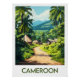 Immerse yourself in rural Cameroon with this illustrated poster. A dirt path winds between traditional huts, surrounded by lush greenery and tropical hills. A vibrant scene perfect for authentic and natural wall art.