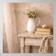 This French country farmhouse poster features a rustic wooden table styled with a white ceramic pitcher filled with delicate flowers, vintage books, and a soft tassel garland. The warm neutral tones and gentle textures create a calm cottage atmosphere inspired by classic French farmhouse interiors. Perfect for farmhouse kitchens, bedrooms, entryways, and cozy cottage homes, this poster adds timeless rustic charm and relaxed country elegance to any wall.