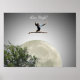 Gymnast soars over a full moon. Moon glow brightens the dark sky and outlines the gymnast stretching in mid-leap.Tree top at bottom left.