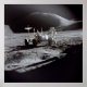 "Astronaut James B. Irwin, Lunar Module pilot, works at the Lunar Roving Vehicle during the first Apollo 15 lunar surface extravehicular activity (EVA-1) at the Hadley-Apennine landing site. The shadow of the Lunar Module "Falcon" is in the foreground. This view is looking northeast, with Mount Hadley in the background..