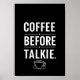 This black and white funny quote poster “Coffee before talkie” is a witty, bold statement piece for kitchens, offices, or cafes. Clean typography with coffee icon adds personality. Multiple sizes and finishes available.