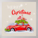 Posters for Merry Christmas, with a cute illustration of a festively decorated car with fir branches and boxes with presents on the roof.