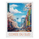 Illustrated poster from South Korea depicting a busy street in Seoul lined with cherry blossoms, colorful neon lights and skyscrapers. A vibrant wall decoration that captures the spring and urban energy of the Korean capital.
