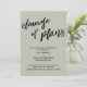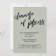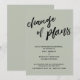 This simple suite's distinction is due to the modern, handwritten script font used for accent phrases. In this piece, the hand-lettered script font was used to create a graphic that reads "change of plans", large and bold. Use the template fields to add your personal details and make this unique, modern design your own. The background can be changed to any colour you prefer. Please reach out with any special requests or for customising assistance. // 100 //