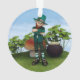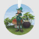 3D digital render of a leprechaun standing near a pot of gold, a mushroom and shamrock plants. Perfect St Patricks day gift