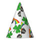 Party hat features a pot of gold at the end of a rainbow, and a bright green lucky shamrock. Great for celebrating Saint Patrick's Day.