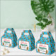 A playful and festive holiday pattern shows cute potatoes wearing Santa hats against a snowy blue background. It adds a quirky and funny touch to Christmas celebrations. This whimsical winter design combines bright seasonal colours with cheerful character repeats. It's perfect for anyone who enjoys a fun and unique holiday style. On the front is a label black, red and green festive text reading "Have A Spudtacular Christmas" Below this text are two happy brown potatoes facing each other one with a pink bow on its head, in-between the potatoes is a template to add your own text to personalise.